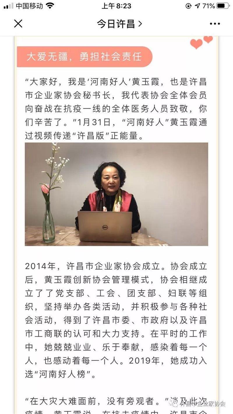 新冠病毒 來勢(shì)兇猛,時(shí)刻牽動(dòng)著許昌市企業(yè)家協(xié)會(huì) 每一個(gè) 會(huì)員的心。在這場(chǎng)沒有硝煙的戰(zhàn)"疫" 中, 企業(yè)家協(xié)會(huì)積極響應(yīng)市委、市政府的號(hào)召,迅速行動(dòng),全力支援武漢、許昌等地區(qū)疫情防控, 為抗擊疫情貢獻(xiàn) 自己的一份力量。企業(yè)家 協(xié)會(huì)秘書長(zhǎng)黃玉霞作為"河南好人"代表,通過《許昌晨報(bào)》視頻傳遞"許昌版"的正能量,她呼吁許昌企業(yè)家 奉獻(xiàn)愛心支援許昌、武漢,努力擔(dān)當(dāng)社會(huì)責(zé)任,共同抗擊疫情,共克時(shí)艱 。