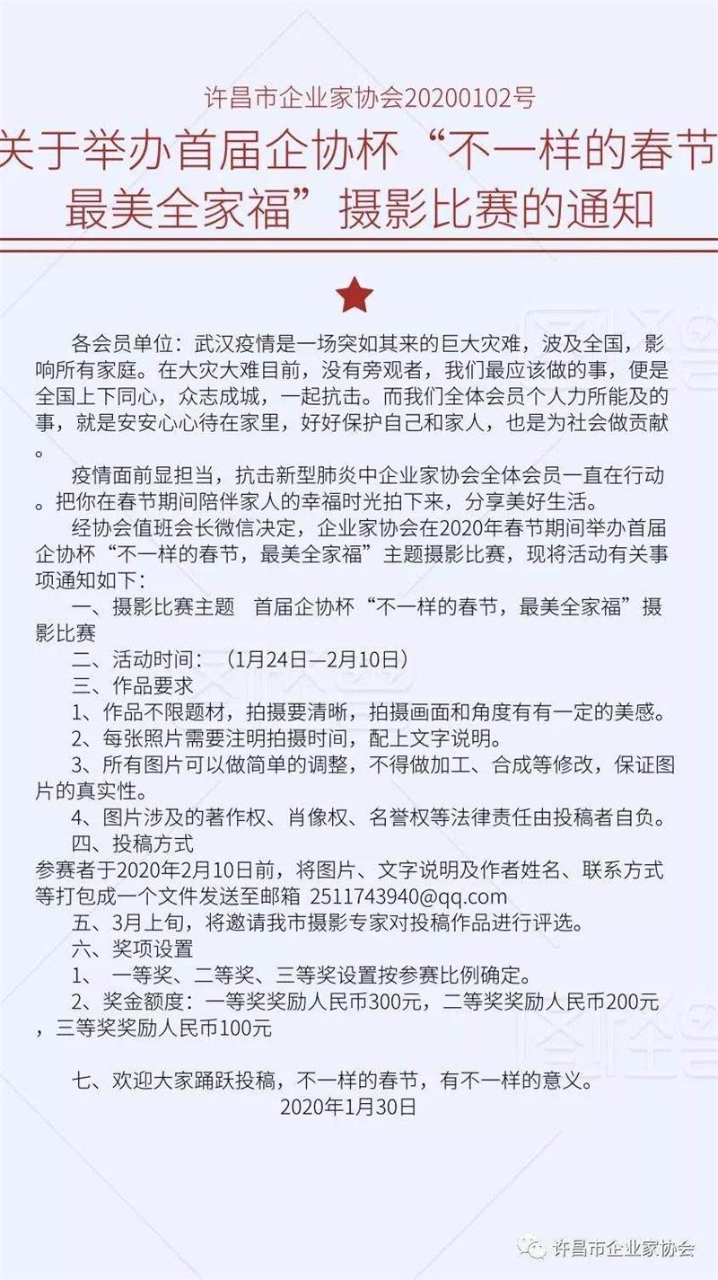 特殊時(shí)期,很多人不得不閉門在家減少聚會(huì)。許昌市企業(yè)家 協(xié)會(huì)擔(dān)心平日忙碌慣的會(huì)員一下子"窩"在家里不習(xí)慣,及時(shí)在微信群里發(fā)布了《關(guān)于舉辦首屆企協(xié)杯"不一樣的春節(jié),最美全家福"攝影比賽的通知 》,動(dòng)員會(huì)員珍惜與家人團(tuán)聚的美好時(shí)光,把與家人團(tuán)圓的美麗畫面記錄下來,分享給大家。這項(xiàng)活動(dòng)受到了廣大會(huì)員的稱贊,稱這是"不一樣的春節(jié),不一樣的祝福"。