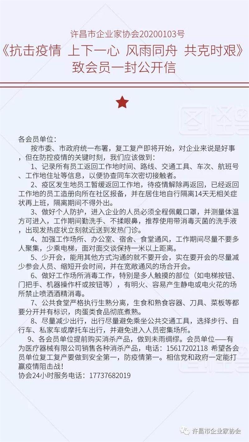 按照許昌 市政府關(guān)于做好疫情防控工作的要求,在即將復(fù)工開業(yè)前, 企業(yè)家協(xié)會(huì)向全體會(huì)員發(fā)出了《抗擊疫情、上下一心、風(fēng)雨同舟、共克時(shí)艱》的公開信,號(hào)召會(huì)員企業(yè)嚴(yán)格按照政府 安排 ,全面做好疫情防控工 作。協(xié)會(huì)秘書處在微信群里轉(zhuǎn)發(fā)了 100多條黨中央、國務(wù)院關(guān)于做好疫情防控工作的重要指示,轉(zhuǎn)發(fā)了市委、市政府、市工商聯(lián)等下發(fā) 的疫情 防控政策和措施,讓會(huì)員充分發(fā)揮自身平臺(tái)的優(yōu)勢(shì),為抗擊疫情工作出力。