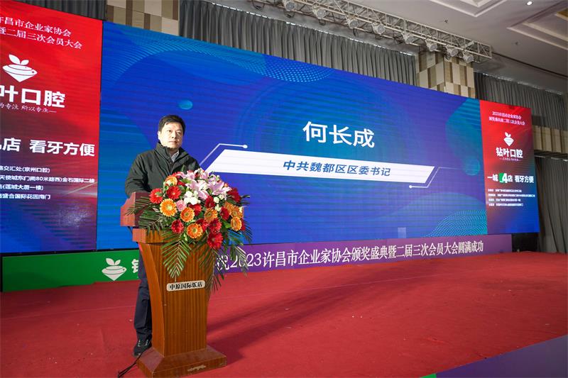 中共許昌市魏都區(qū)委書記何長成在致辭中向來賓介紹了魏都區(qū)經(jīng)濟建設相關情況,對許昌市企業(yè)家協(xié)會年會的召開表示熱烈的祝賀,他感謝協(xié)會成立9年來,充分發(fā)揮橋梁紐帶作用,為推動全市全區(qū)的經(jīng)濟發(fā)展作出的積極貢獻;希望廣大企業(yè)家進一步增強歷史使命感和榮譽感,爭做市場經(jīng)濟開拓者,爭做合作共贏的參與者,爭做和諧社會的建設者。